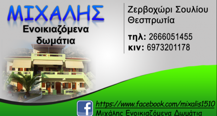 customer tabsΕπικοινωνίαΠλήρως εξοπλισμένα & αυτόνομαΚλιματισμός - Θέρμανση - Τηλεόραση - WifiΆριστη φιλοξενία, εξυπηρέτηση, καθαριότητα,ιδιοκτητο παρκιν, κηπος!!!όλο τον χρόνο ανοιχτά... Ενοικιαζόμενα Δωμάτια - ΔιαμερίσματαΤουρισμόςΖερβοχώρι παραμυθιας θεσπρωτιας10 χιλιομετρα από πηγές ΑχέρονταΠΑΡΑΜΥΘΙΑ ΘΕΣΠΡΩΤΙΑΣΘΕΣΠΡΩΤΙΑΗΠΕΙΡΟΣ 2666051455 6973201178 6975831579 6973201178mimis151@yahoo.grhttps://www.facebook.com/mixalis1510?ref=bookmarks Το προτείνω (έχει προταθεί 1 φορές) ΦωτογραφίεςΠροσφορές ΕΝΟΙΚΙΑΖΟΜΕΝΑ ΔΩΜΑΤΙΑ - ΜΙΧΑΛΗΣFacebook LikeShare on FacebookTweet Widget